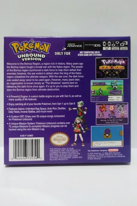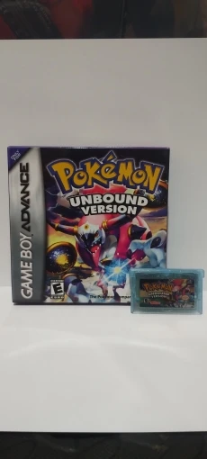 This is a Pokemon ROM Hack called Pokemon Unbound for the Gameboy advance! The design on the cartridge and cover are made by us! Can be played on gba, gba SP, NDSL and GBM!