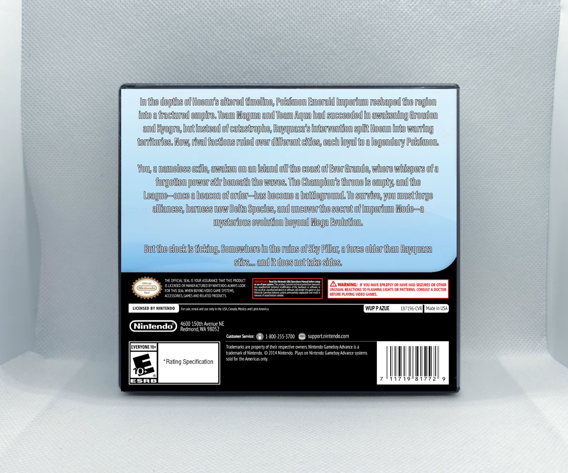 This is a Pokemon ROM Hack called Pokemon Emerald Imperium for the Gameboy advance! The design on the cartridge and case is made by us! Can be played on gba, gba SP, NDSL and GBM!