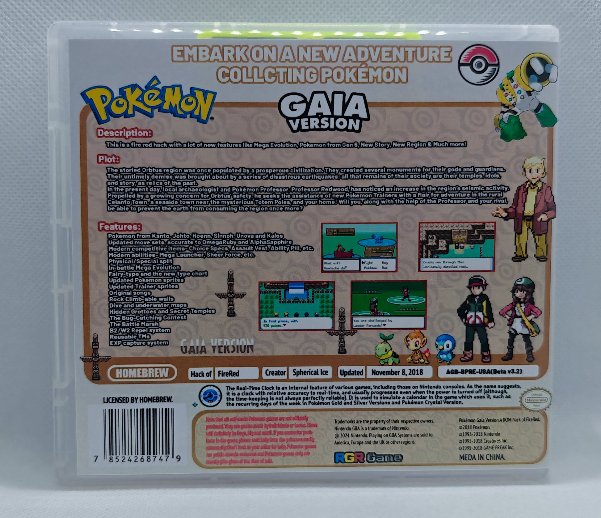 This is a Pokemon ROM Hack called Pokemon Gaia for the Gameboy advance! It's in our first batch of RTC (Real Time Clock) rom hacks! Please feel free to check out our store for more RTC cartridges! Can be played on gba, gba SP, NDSL and GBM! There's 2 options to choose from, with or without case!